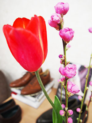 今週の花は桃とチューリップです。