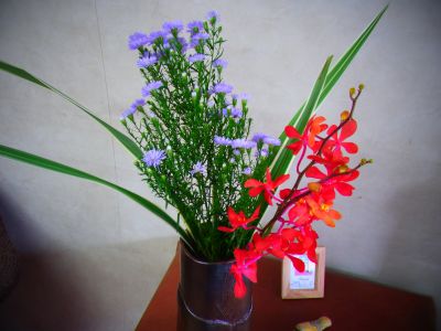 手前の赤い色の花がキキョウラン、青の花がアランダ―、
