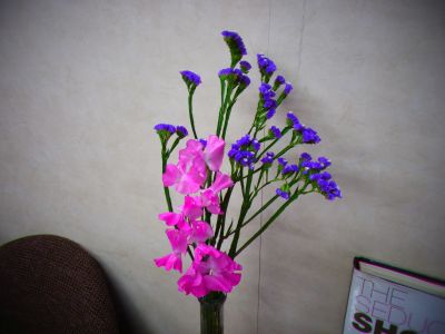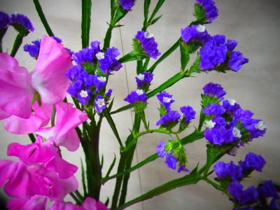 少し色の濃いスイートピーと紫のスターチスです