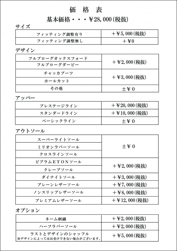 さて、この度パターンオーダーの価格表が、