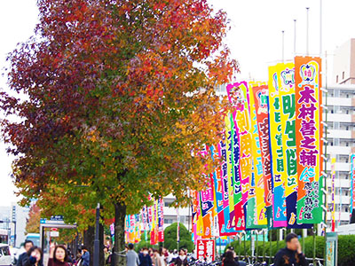 紅葉と色とりどりの幟がきれいな会場付近です。